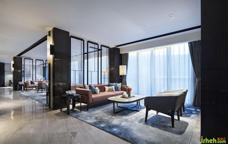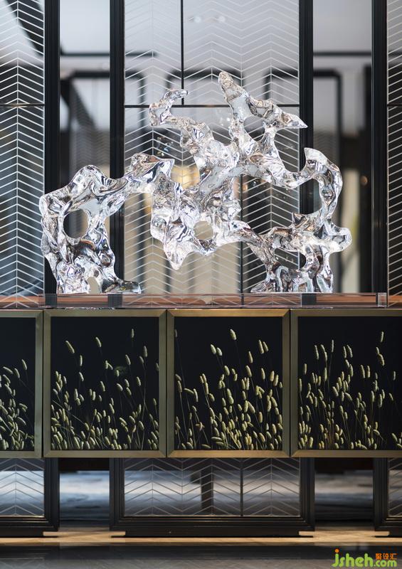洽談區(qū)設(shè)有獨(dú)立區(qū)間和吧臺(tái),室內(nèi)設(shè)計(jì)師以色調(diào)沉穩(wěn)的不銹鋼和光面直紋樹脂板材質(zhì)的藝術(shù)屏風(fēng)為分隔,營(yíng)造出尊貴私密的商談氛圍。在隔與不隔間,引入自然景觀,模糊了界限,開闊了視野。
