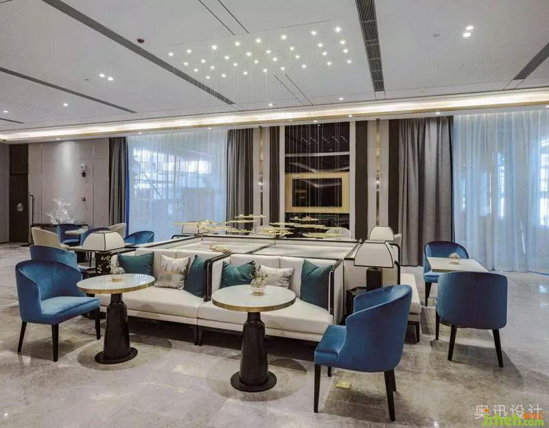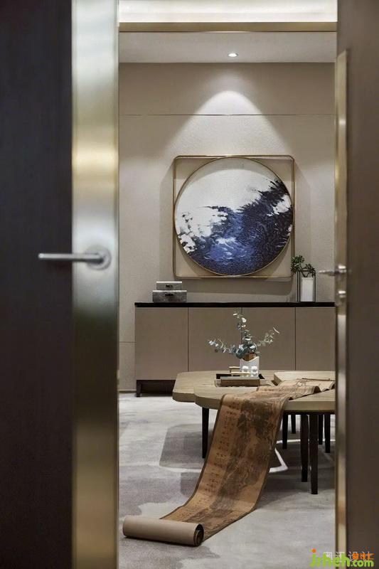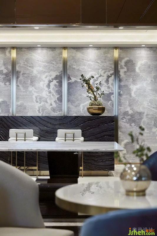 洽談區(qū)的空間布局延續(xù)了建筑的軸線關系,通過淡雅的藍、柔暖的白、知性的靛青等色彩的碰撞,增添了空間明亮的通透感。大篇幅的藝術背景畫伴隨著金屬的分割和暈染效果,融合山水意象的擺件,通過光影的視覺沖擊給空間注入力量,營造出靜謐的禪意?;氐娇臻g的本質,營造內斂平和的洽談氛圍,閑看花開花落,靜品茶甘茶香。