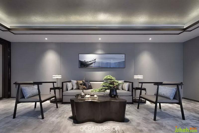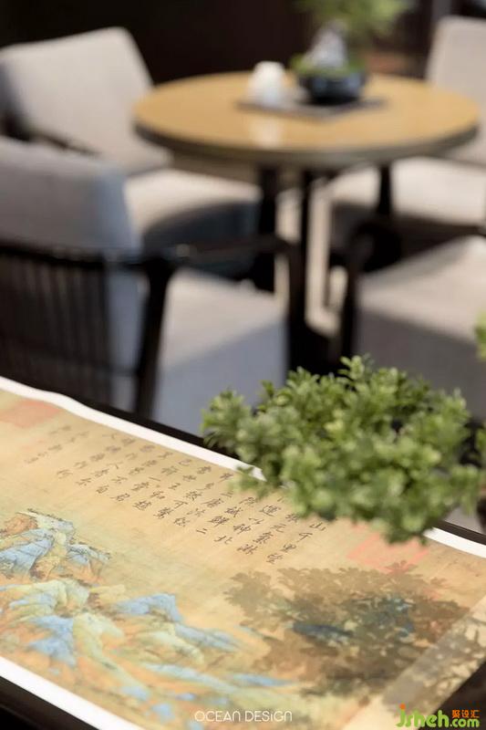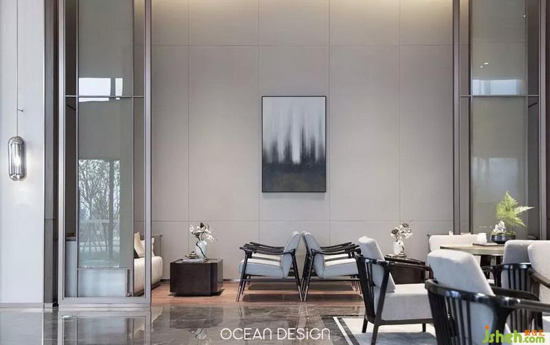 移步洽談區(qū),保留著中軸對(duì)稱的開放式布局,融入飄逸靈動(dòng)的中式傳統(tǒng)風(fēng)格,結(jié)合現(xiàn)代審美藝術(shù),形意兩全。這里沒(méi)有濃郁的商業(yè)氛圍,設(shè)計(jì)師將清新卻不失典雅的高級(jí)灰與現(xiàn)代元素結(jié)合在一起,讓人仿佛置身于現(xiàn)代都市的山水景色之中。