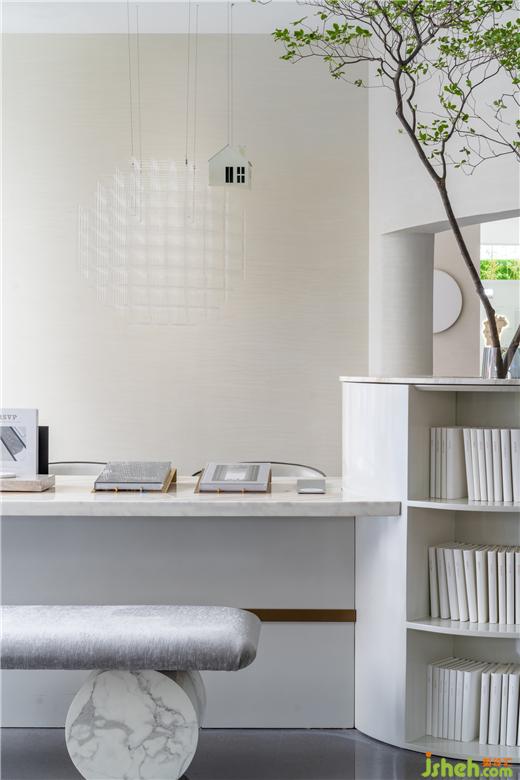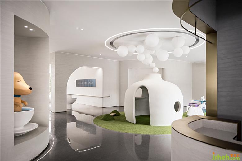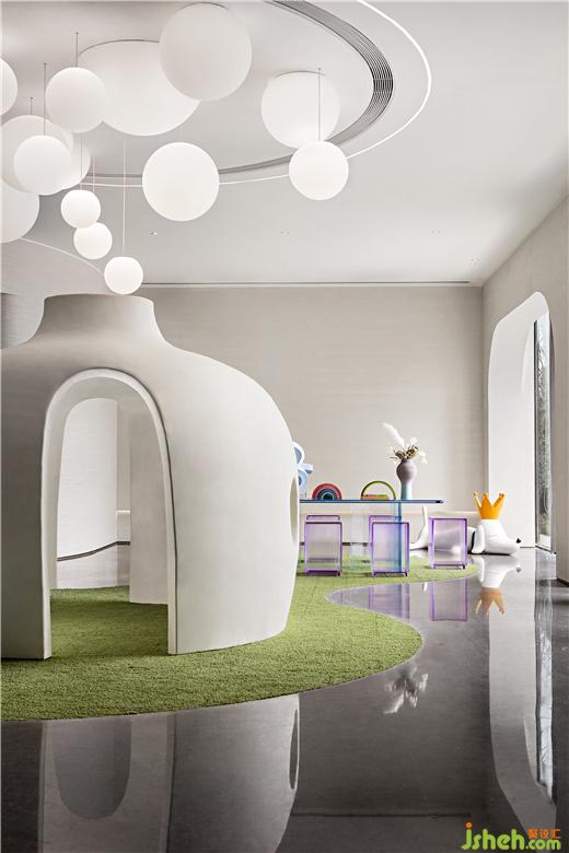 親子活動區(qū)域內(nèi),是聯(lián)動周邊可激發(fā)創(chuàng)作的藝術(shù)裝置組合而來的尋仙蹤影。設(shè)計分解空間動線與故事線索的邏輯關(guān)系,在此基礎(chǔ)上,軟裝增加了相對具象的藝術(shù)造型加強空間對心理層面的暗示,從情態(tài)上既意味著房子,穿梭其中,又賦予了空間一種交錯與平緩的體態(tài)。