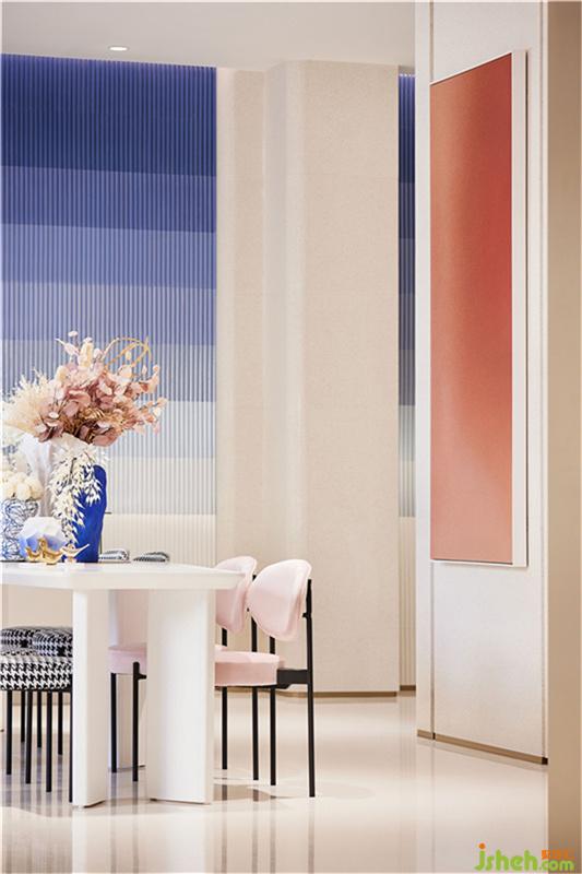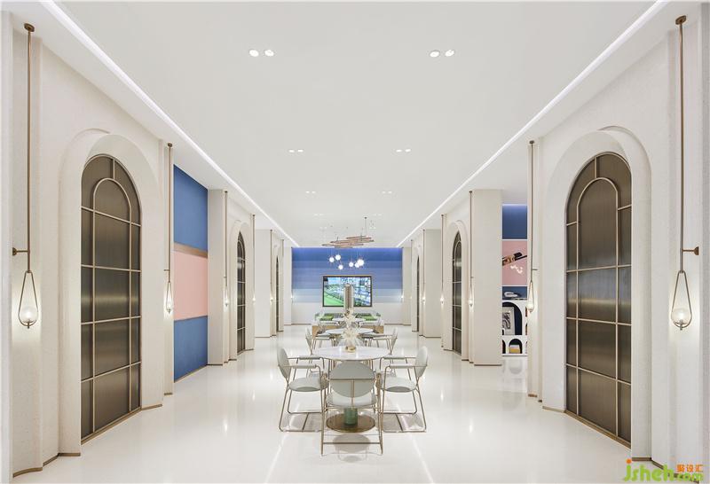 自然界中有形的東西是流動的,但是構成這些有形物質的“形式”或“理念”卻是永恒不變的。在前廳中,設計師引入“兔子精靈IP”建造入口處景觀,加以“伊甸園的果粉與黛藍”氛圍營造,形成與顧客良好的步入體驗,串聯(lián)起童話夢幻場景,演繹一幅無限貼近主題的藝術速寫。