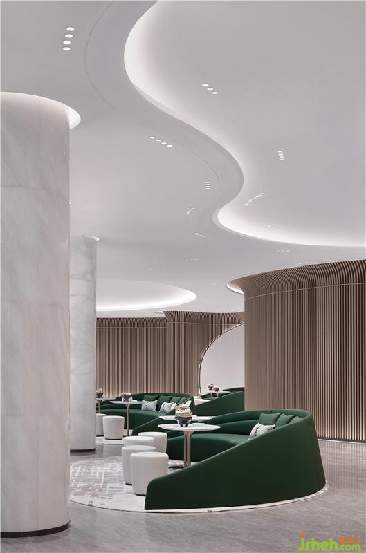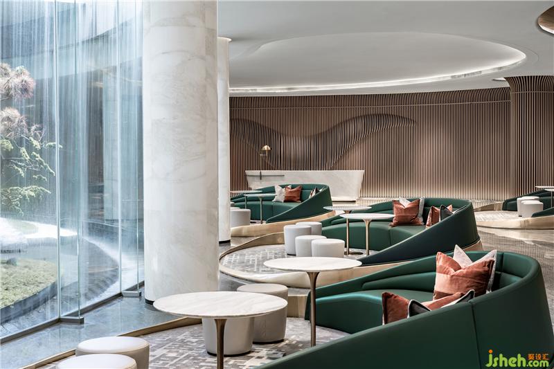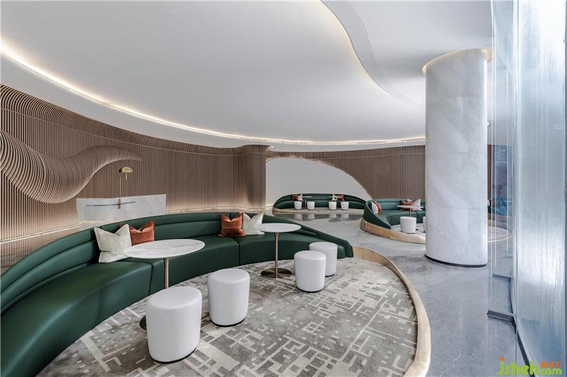 延續(xù)“穿谷溪岸”的靈動基調(diào),空間環(huán)抱式的綠植墻引入室內(nèi),不僅是形式的陳設(shè)美感,更多的是通過視覺美表達它與整體空間的線條。