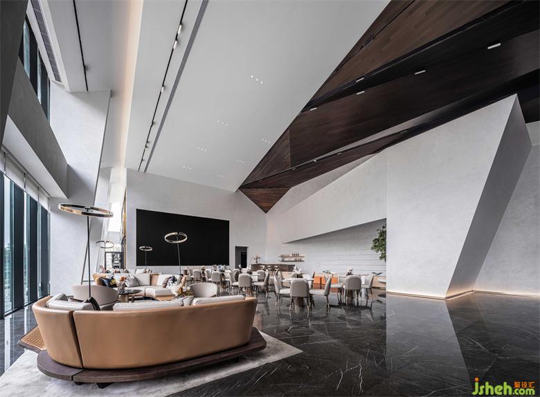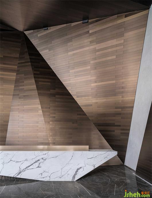 接待大廳以鏡面不銹鋼與幾何金屬防火板的碰撞融合,構(gòu)成空間的多維度群山造型呈現(xiàn)。沉穩(wěn)的大理石在廣博的紋理中,嵌入黑金漸變的色調(diào),婉若天空微亮前的山巒金頂,使觀者置身其中,產(chǎn)生對(duì)歷史記憶的共鳴。