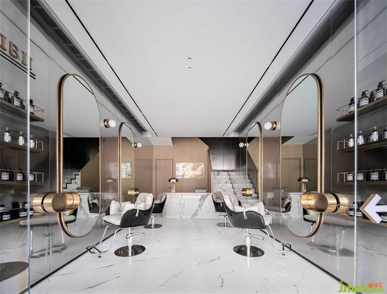 金色隱喻昔日山脈的聯(lián)系,黑色代表對(duì)未來的敏銳探索。在美發(fā)沙龍商鋪設(shè)計(jì)中,奧迅選取沉穩(wěn)的黑金來打造摩登精致主義與返璞自然的平衡。