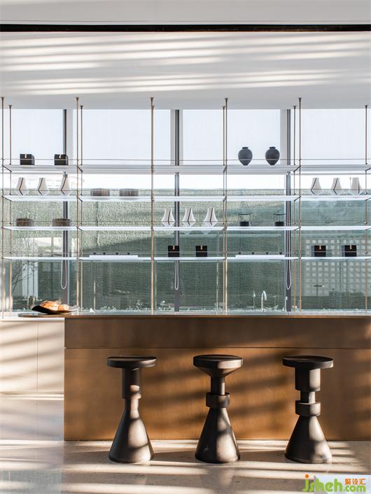 緩步前行,體會設(shè)計師以巧妙的“隱”手法,將接待臺與水吧連成一體。伴隨著晨間的光影肆意舞動,映射出一種質(zhì)樸淡泊的生活意境。