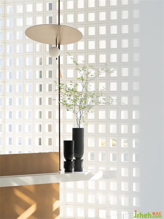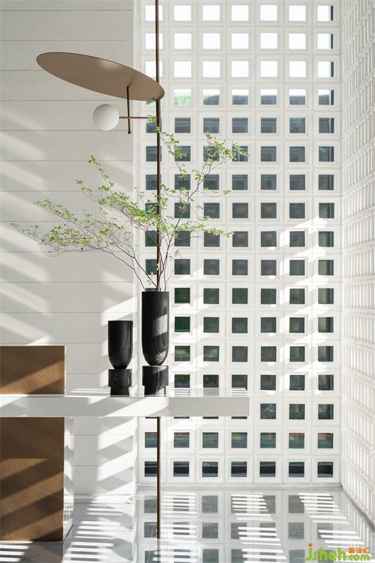 剛?cè)腴T廳,便見晨光透過整面仿古鏤空方格疊合墻體,間隔室內(nèi)外的虛實之別,一步一景,循著光的斑駁,呼吸著浸潤澄湖的自然氧氣,詩意開啟。