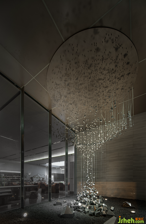 售樓部設(shè)計的關(guān)鍵思考,不僅在于傳遞美好情感,還在于暗處中提升項目的產(chǎn)品力。戶外垂懸傾瀉的藝術(shù)裝置,以大氣磅礴之感豐富視覺層次的同時,模糊了現(xiàn)實空間,讓詩意的氣韻流動起來。