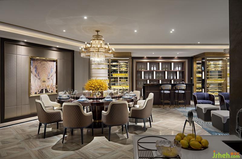 漫步至宴客廳,采用了視野開闊的開放式格局,時尚大氣的高級定制家具和寬敞的空間演繹世家風度。通過精簡靈動的曲線,在創(chuàng)意吊燈、地毯等不同的“形”與“色”融為一體,突顯藝術(shù)品位,瞬間有一種浮華過境般浸染了整個空間的畫面,似時光留駐,又有幾許悠然。