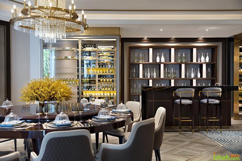 另一側(cè)的餐廳以設(shè)計的語言將藝術(shù)和創(chuàng)意灑落在生活的細節(jié)處,創(chuàng)造性地將地面采用水晶木紋石幾何拼接,同時對餐廳的格調(diào)作了延續(xù),如金屬框架的玻璃紅酒架,深色簡約餐桌和米灰皮餐椅的搭配,讓人們深入空間不自覺地感受到一股暖流和時尚輕奢風在空間碰撞交響。這是家的味道,也是幸福的味道。