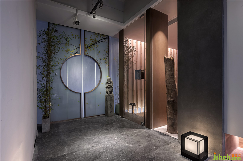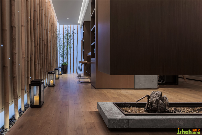 推門而進,竹林淺語,提燈而行。長廊靈感來自于詩人劉長卿的《送靈澈上人》,“蒼蒼竹林寺,杳杳鐘聲晚。荷笠?guī)标枺嗌姜氝h歸。”