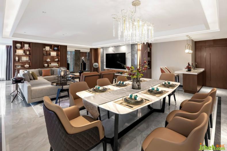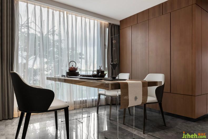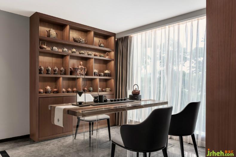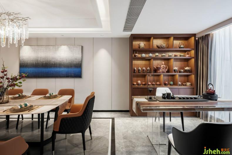 空間劃分過程中,各功能區(qū)呈遞進式布局。開放式客廳、餐廳、茶室、休閑區(qū)、吧臺都被容納到同一個生活場景;室內設計師以及利用木墻隔斷將茶室、休閑區(qū)間隔開,視覺上形成“一室多用,互不干擾”的效果,同時維系各個功能區(qū)域的秩序,增強空間層次感。