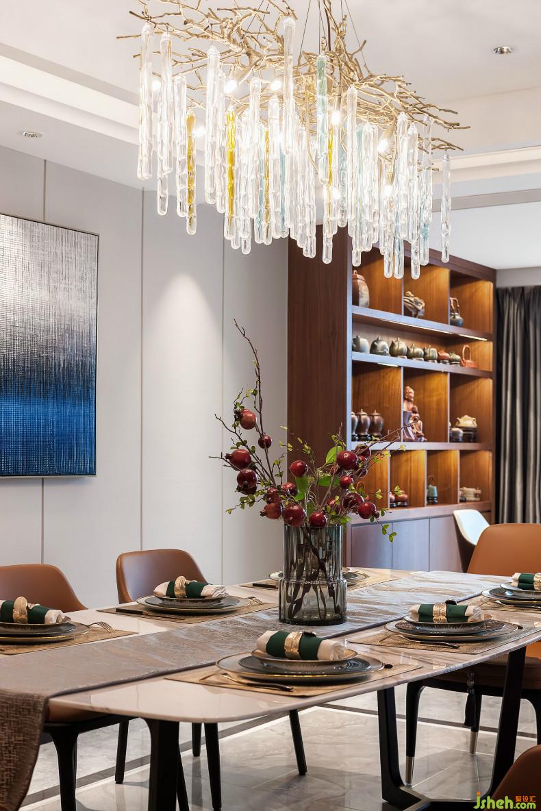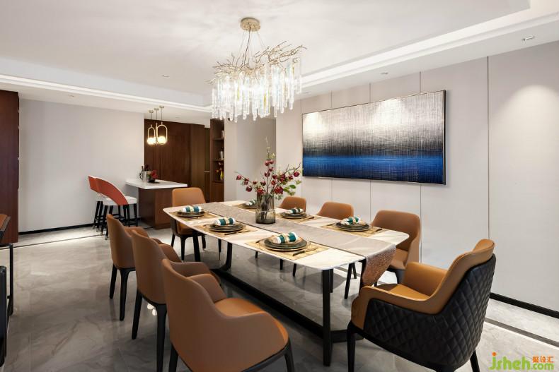 餐廳設計為避免視覺雜亂,只保留了清晰素凈的元素。室內設計師藝術燈飾與背景墻畫在簡約氣質下,給人寧靜安逸的質感。