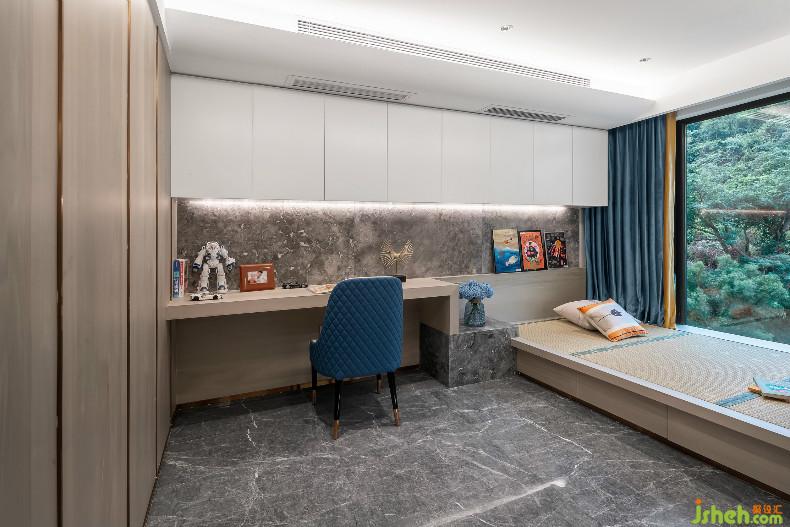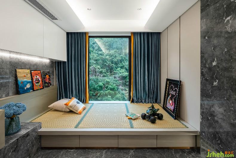 而大面積落地窗設計完美地將自然景色引入室內,且隨著時間的變化,能夠賦予空間萬種不同的生活意境,因此在格局設計上,以線條簡化,木色鋪墊,使空間簡凈而不顯冗雜,室內設計師無論是在此休憩片刻,或是填補精神世界,都極為安靜舒適