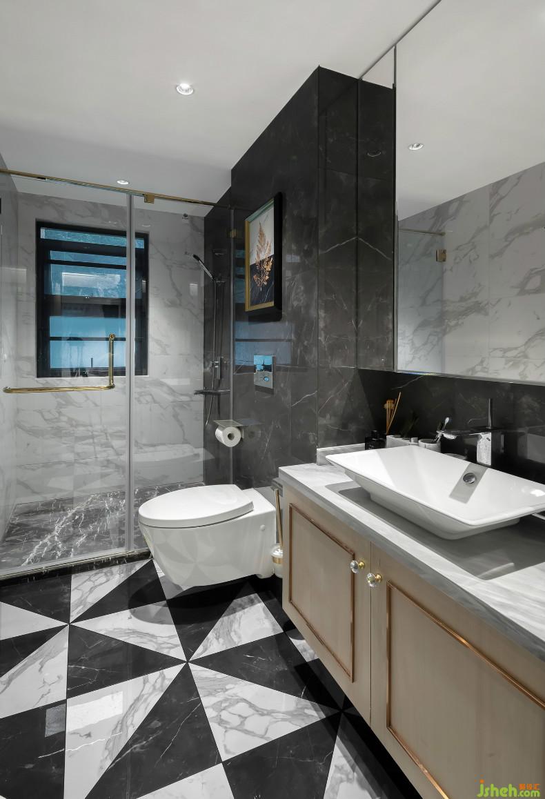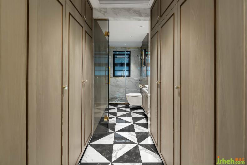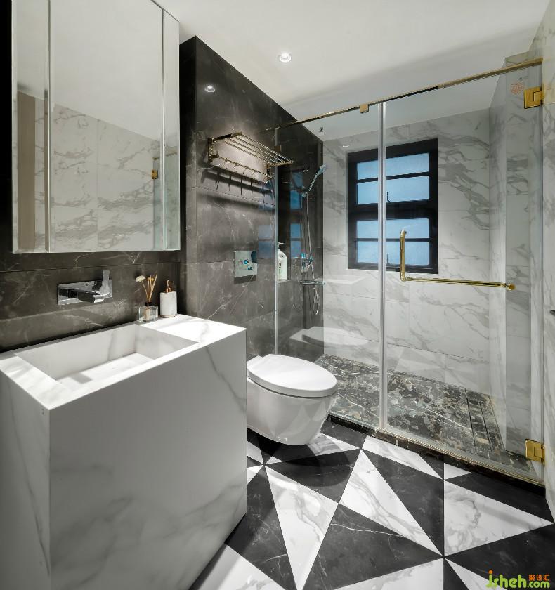 主衛(wèi)在這個空間中的設(shè)計風(fēng)格顯得摩登而時尚感十足,幾何藝術(shù)地板與大理石所構(gòu)成的簡約奢華,將主人對于追求品質(zhì)生活的向往提升到了另一層高度。室內(nèi)設(shè)計師設(shè)計格局上,主臥行至衣帽間,再到主衛(wèi)的路徑設(shè)置,為生活塑造了一種精致的儀式感。