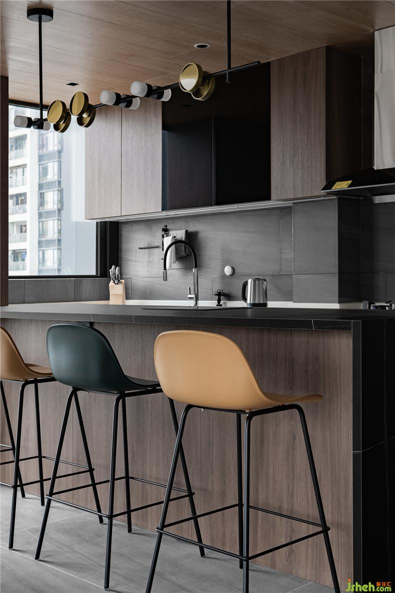 餐廳與開放式廚房在整個(gè)空間中,是為都市人準(zhǔn)備的放松身心之地。室內(nèi)設(shè)計(jì)師白黃交織的個(gè)性燈光與高腳椅照映著空間氣質(zhì),在吧臺(tái)位置處,顯得小資而具有生活情調(diào)。