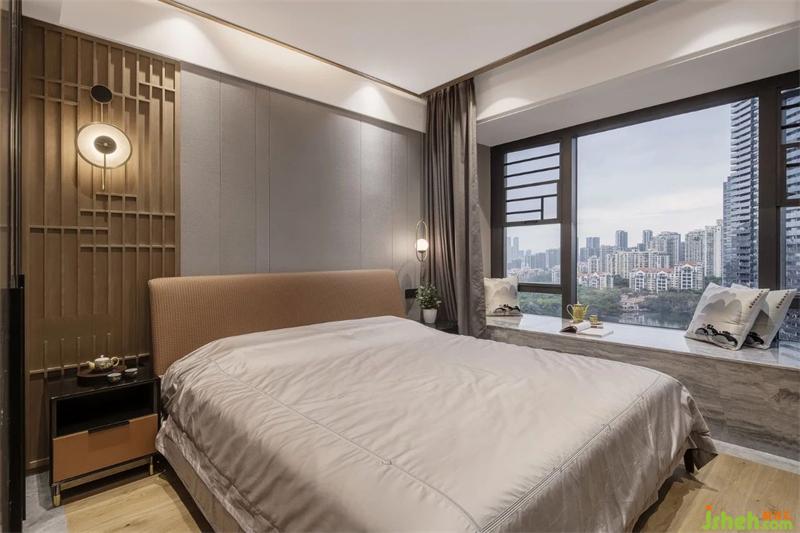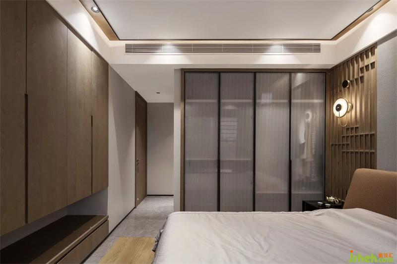 “靜聽四季詩吟,坐看云舒云卷”主臥在風(fēng)格上承接了設(shè)計的東方主題,但更加獨立且幽靜,仿佛是城市中的一舍隱居,形式上也更深沉富有質(zhì)感。