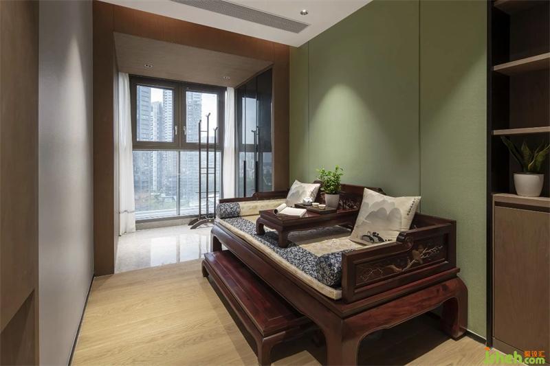 當(dāng)光影落下,心靈歸于平和,綠色的背景墻與古色古木的中式座椅如詩一般,清雅雋永,正對了那句:“談笑有鴻儒,往來無白丁??梢哉{(diào)素琴,閱金經(jīng)。無絲竹之亂耳,無案牘之勞形?!?
