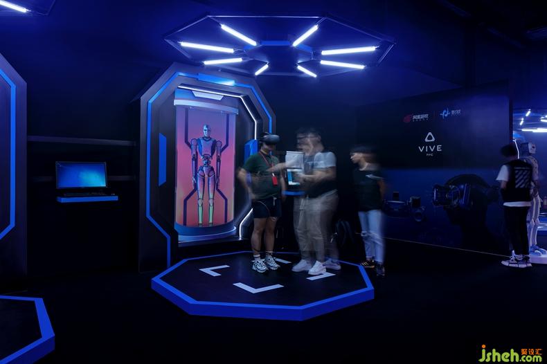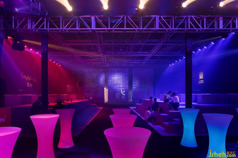 燈光彌散在紅藍(lán)二色的世界里,留下虛幻的幾何展臺。舞臺區(qū)域?yàn)楦髀酚螒蜻_(dá)人的交流提供了開放的平臺。有色光的映襯下,一切都被附上全新顏色,真實(shí)消解在虛擬中。