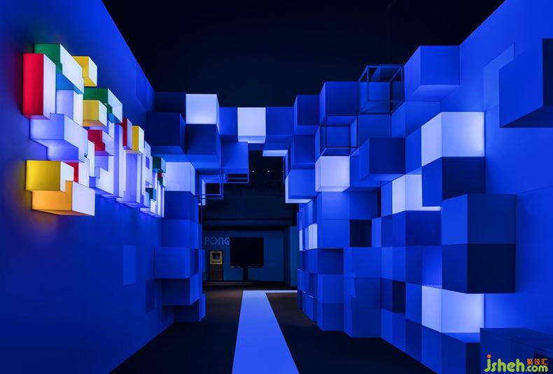 設(shè)計(jì)公司展覽平面、室內(nèi)及建筑立面進(jìn)行了像素化的拓展,整個(gè)展覽空間變成了巨大的像素迷宮。在這個(gè)迷宮中能帶給玩家如同超級馬里奧游戲一樣,可以在方塊上跳躍的感覺,最大程度上喚醒玩家兒時(shí)的快樂回憶。