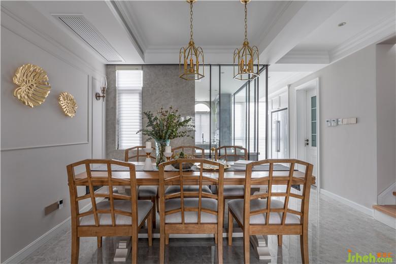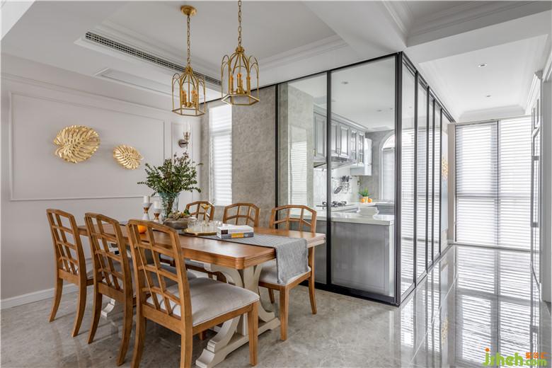 一層的縱深很大,原戶型實(shí)墻阻隔了來自廚房的光線,使得位于中部的餐廳陷入暗淡無光的困境。因此室內(nèi)設(shè)計(jì)師采用多聯(lián)動(dòng)玻璃移門,讓兩邊的陽光成功牽手,整個(gè)家也變得通透起來。