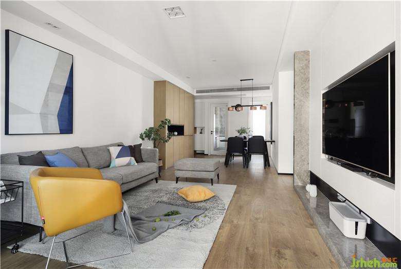 簡(jiǎn)的表象之下隱藏著別味的設(shè)計(jì)感。姜黃色皮質(zhì)單椅豐富了客廳區(qū)域的設(shè)計(jì)語(yǔ)言,與沙發(fā)抱枕和裝飾畫(huà)中的藍(lán)色,室內(nèi)設(shè)計(jì)師在視覺(jué)上營(yíng)造了極具時(shí)尚沖擊的空間色彩。