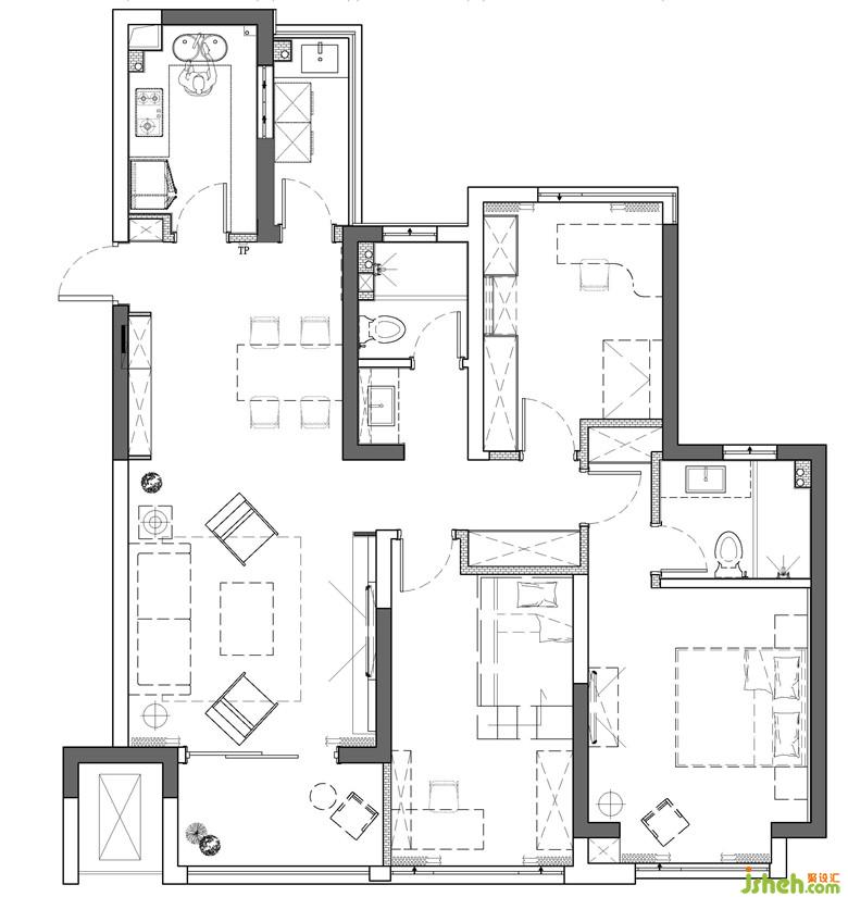 璃與玻璃之間,也存在細微差別。洗衣房的門正對餐廳區(qū)域,采光的同時還需考慮居住隱私,因此選擇磨砂玻璃;而廚房為了彌補玄關的采光則選擇透明玻璃門,也讓居住過程更純粹地傳達出真實生動的生活狀態(tài)。