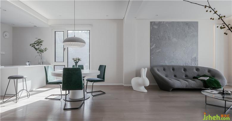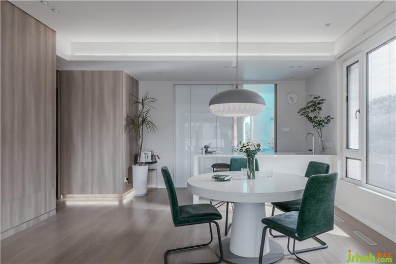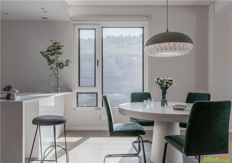 餐廳是綠色清新色調(diào),簡(jiǎn)單的花木替代繁復(fù)華麗的插花,素樸中由近及遠(yuǎn)地透著點(diǎn)點(diǎn)層次,呈現(xiàn)安靜自然的詩(shī)意。一盞別致的吊燈呼應(yīng)圓桌,提升空間關(guān)系變得愈加飽滿(mǎn)。