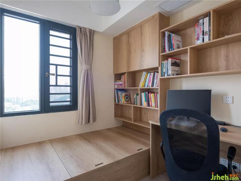 榻榻米房間,延續(xù)了簡潔大方的特點(diǎn),具有收納的功能,同時也是一間書房。男業(yè)主經(jīng)常國內(nèi)外出差,有時候還需要到家里辦公,設(shè)計師根據(jù)業(yè)主的訴求,定制設(shè)計了收納和書架相結(jié)合的榻榻米柜子,滿足了現(xiàn)下家庭居住和辦公需要。