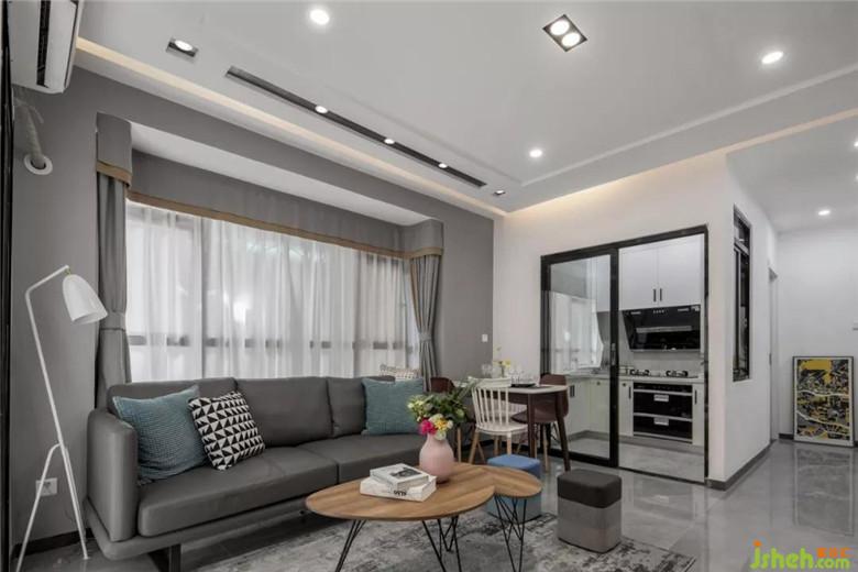 通往廚房和陽臺的運用大面積的玻璃推拉門,光線的彌漫讓原本偏冷調的空間,暖意十足。廚房同樣以黑白灰為基調,簡潔大方,壹切從實用出發(fā),添置生活的必需品,還原生活的本質。