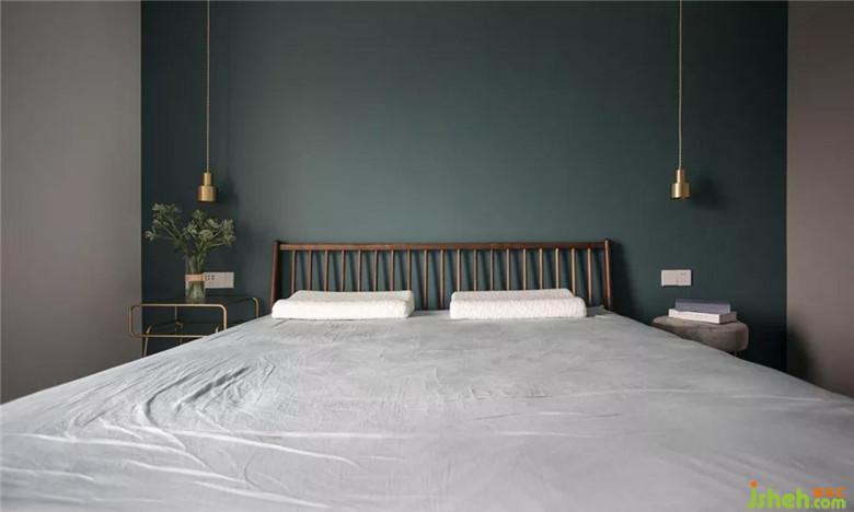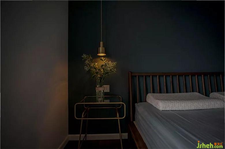 藍(lán)綠色背景墻充滿著一種文藝范,在簡(jiǎn)潔的大環(huán)境中,每一處細(xì)節(jié)都經(jīng)精雕細(xì)琢,無(wú)論是古銅色的吊燈還是別致細(xì)膩的木床架,無(wú)一不顯露著居住人對(duì)藝術(shù)的追求