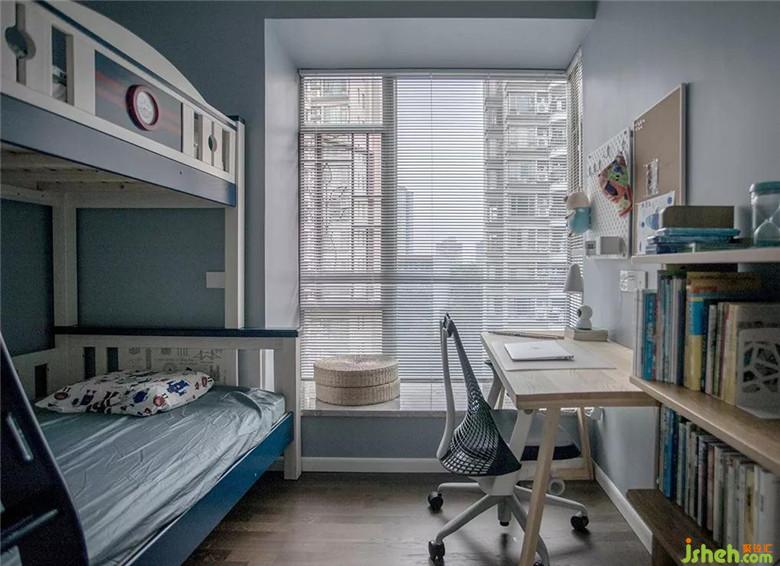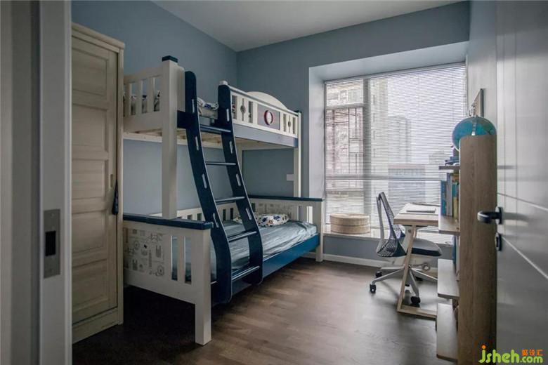 設(shè)計(jì)師為兒童房選擇了主基調(diào)為藍(lán)白的搭配,這更符合孩子活力與跳躍的性格,可攀爬的木梯,可隨意涂鴉的畫(huà)板、玩具、榻榻米,對(duì)于孩子來(lái)說(shuō),這里十分有趣