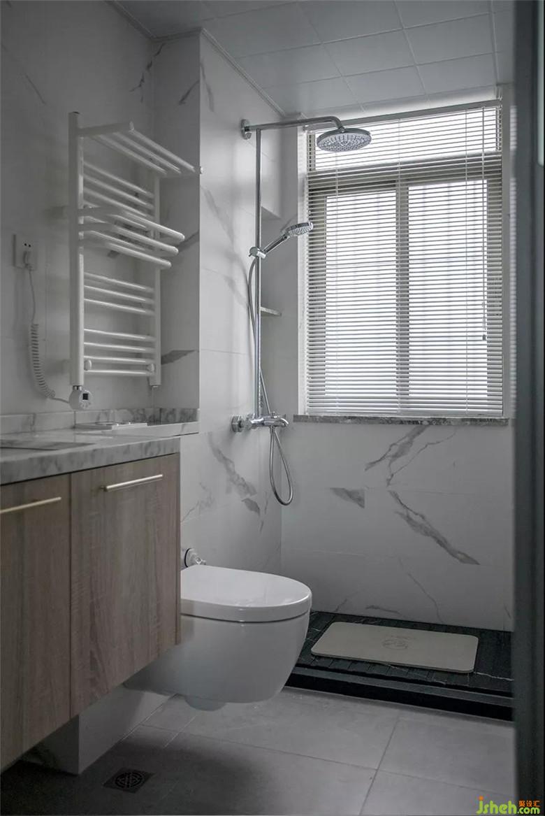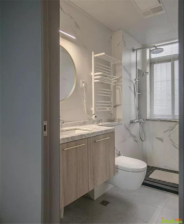 高級(jí)灰衛(wèi)生間,以白色大理石瓷磚為背景,搭配灰色地磚、木質(zhì)洗手盆柜,色彩呼應(yīng)、簡(jiǎn)潔大氣、時(shí)尚有格調(diào),掛壁式馬桶既利于衛(wèi)生打理又顯高級(jí)感,每一處細(xì)節(jié)都能看出主人對(duì)家個(gè)性化的需求