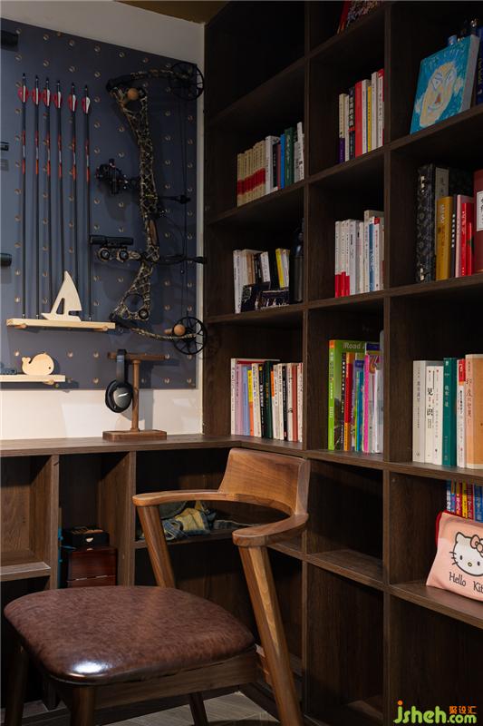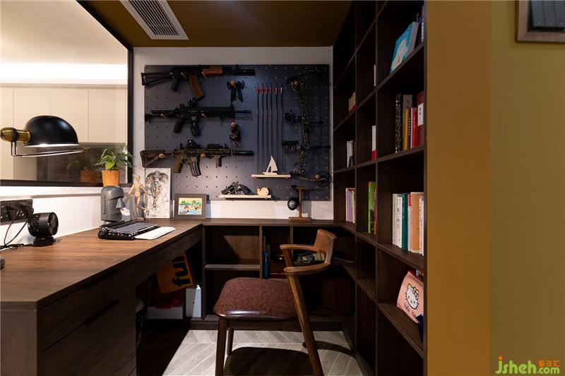書房由原戶型的餐廳改造而來,打破墻體的束縛,與客廳一窗之隔,半墻茶褐色玻璃代替墻體,既能引入客廳的光源,讓小小的書房變得通透許多,也加強了書房與客廳的空間互動。