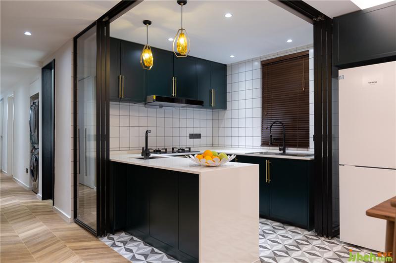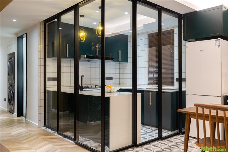 打通原始戶型中廚房的墻體,采用開放式廚房的設(shè)計,黑色邊框的玻璃折疊移門分隔廚餐廳,不遮擋光線,也方便客餐廳之間的溝通。