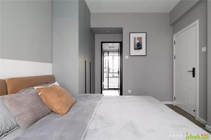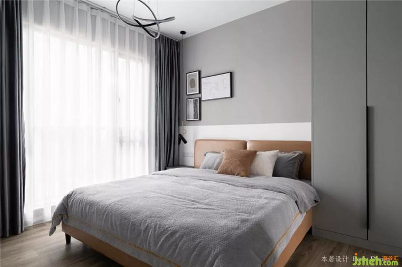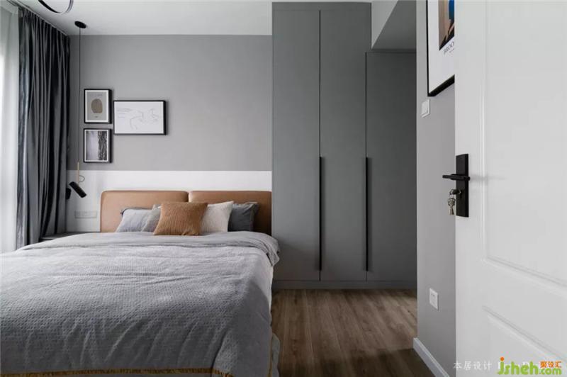 全屋延續(xù)淺灰調(diào)+棕色的配色,棕色床體+灰色柜體+灰色窗簾現(xiàn)代意式風(fēng)格,簡約中透露著高級時(shí)尚感。室內(nèi)設(shè)計(jì)師