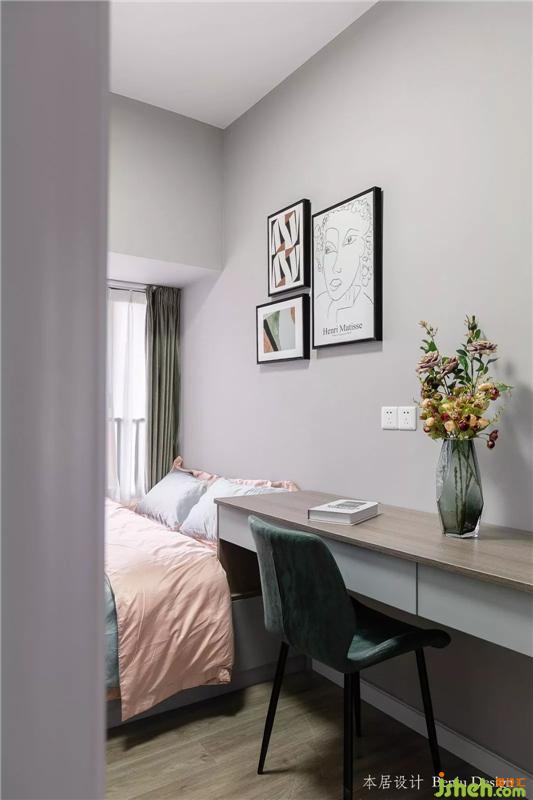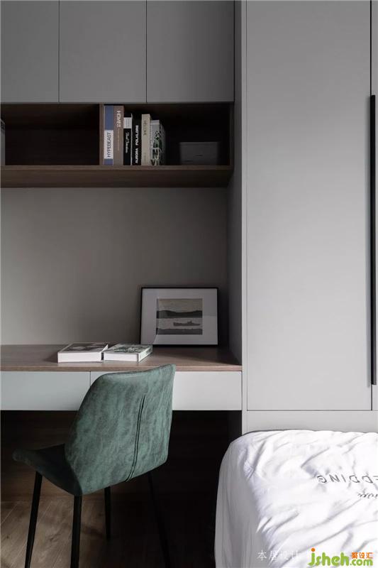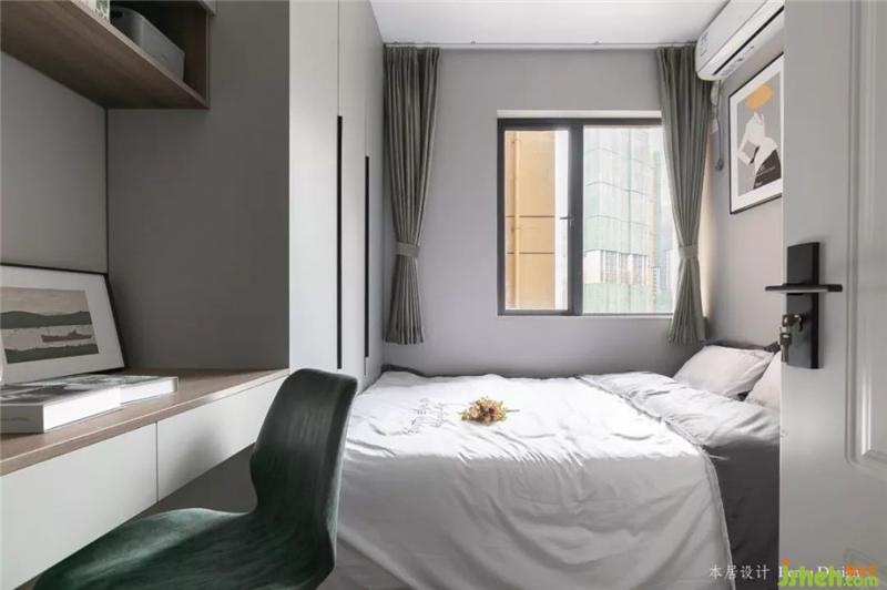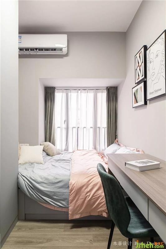 這是入戶后的第一個房間,衣柜+床一體式,懸空式的書桌,不占過多的面積。室內(nèi)設(shè)計師