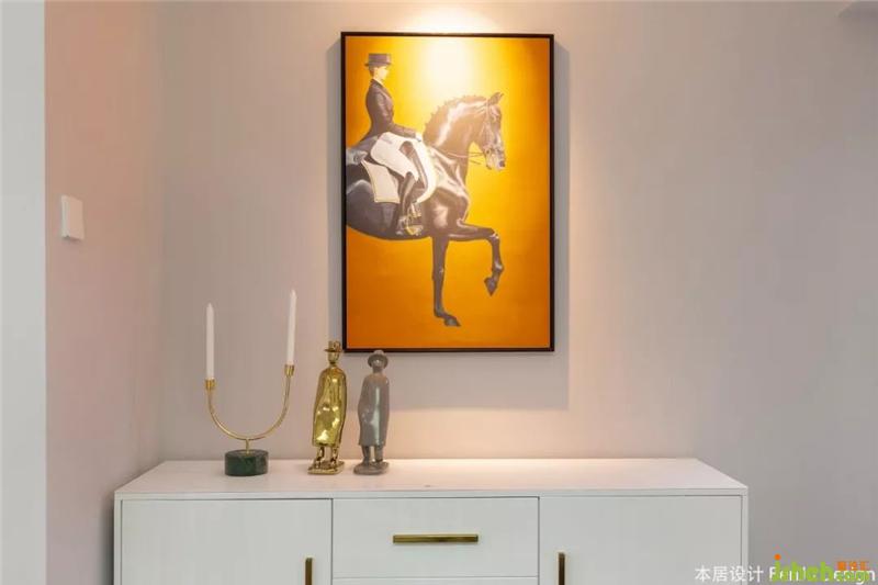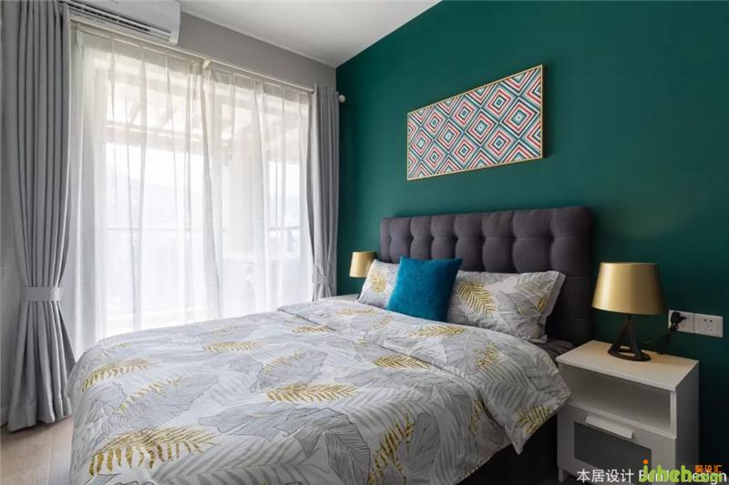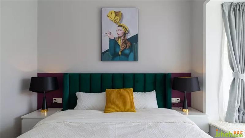 墨綠色的床頭,摩登的插畫,讓臥室的風(fēng)格與客廳截然不同。