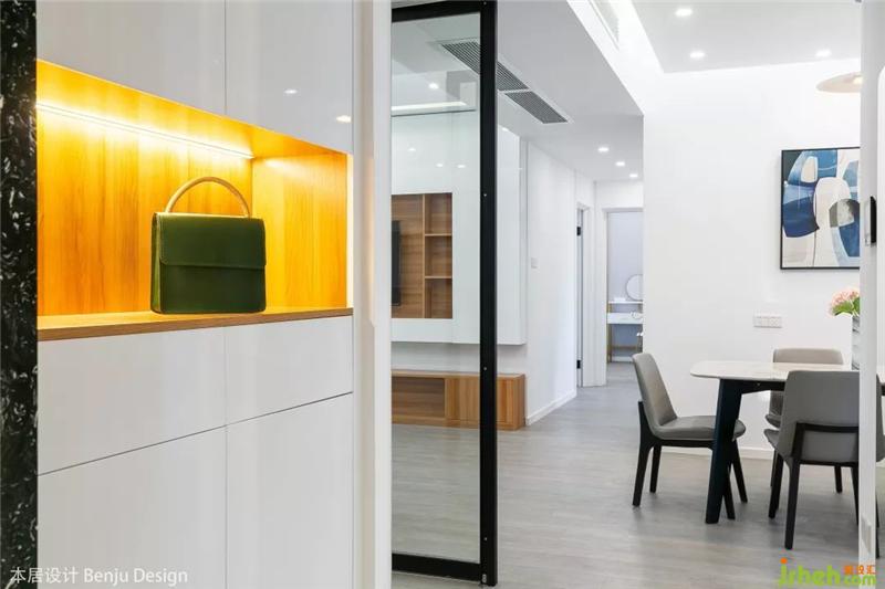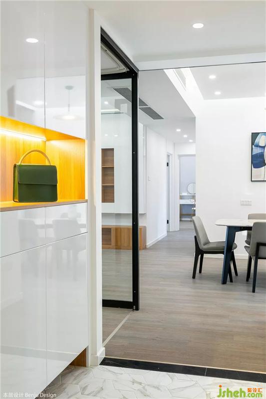 入戶玄關(guān)處,定制了白色+原木配色的鞋柜,我們統(tǒng)計(jì)了夫妻倆具體的鞋子數(shù)量、種類,以此來劃分鞋柜內(nèi)的隔層大小高度,完全符合住戶的生活習(xí)慣。鞋柜還設(shè)計(jì)了開放格,進(jìn)門后隨手放包,出門前再也不會忘記帶鑰匙啦。