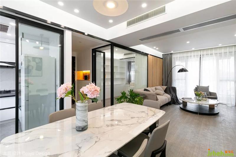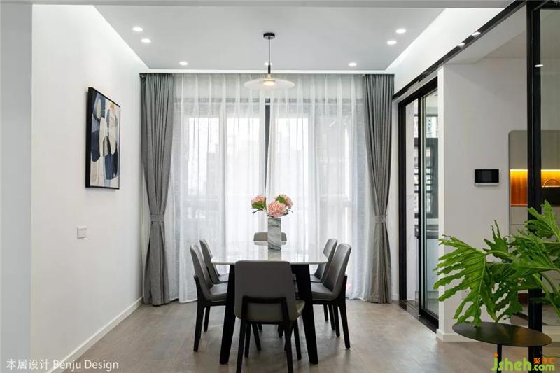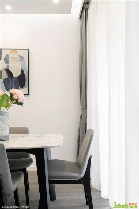 餐廳選用了一張白色大理石紋路的長方形餐桌,聽說女主人特別喜歡花藝,所以我們也在整個空間里放置了各種各樣的花瓶和綠植,讓她以后有更多自我發(fā)揮的空間啦。室內(nèi)設(shè)計師