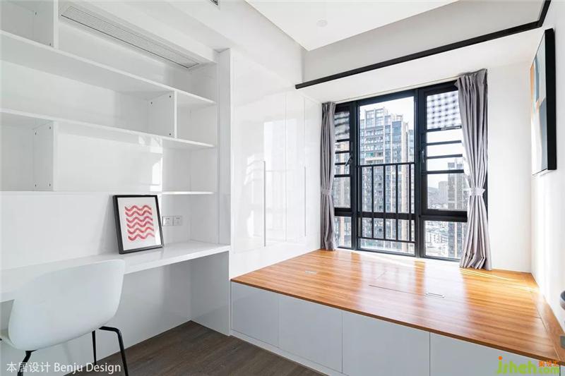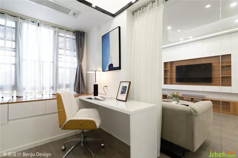 書房的墻體因為有一半是承重墻不能完全打開,所以包上木板加以裝飾,搭配上淺色系的沙發(fā),整體視覺效果還是非常和諧的。室內(nèi)設(shè)計師