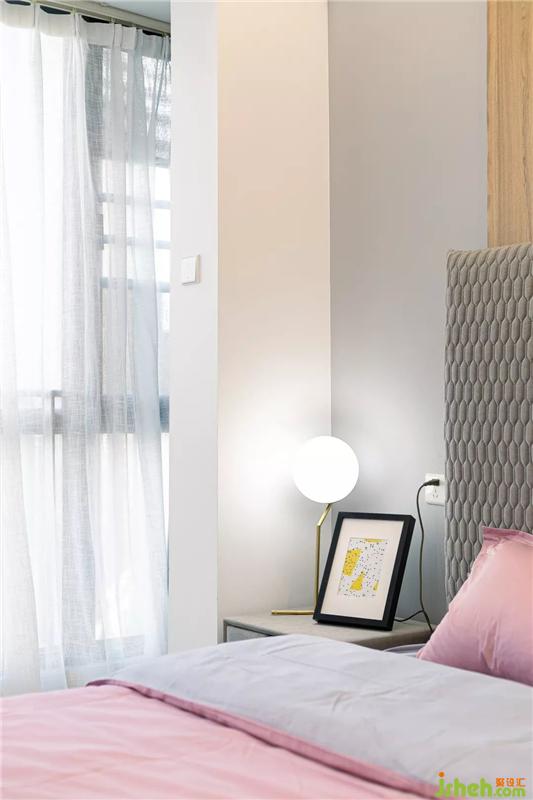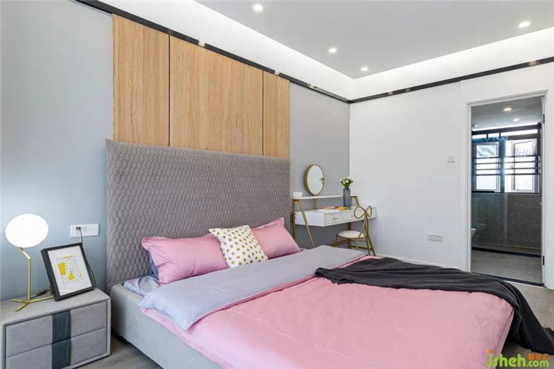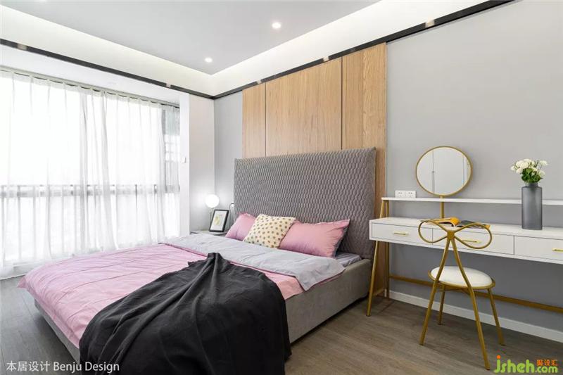 整個主臥的空間顯得非常的通透和明亮,擺放一張1.8m的大床后依然絲毫不覺得擁擠,床頭的背景墻設(shè)計沿用了客廳與書房隔墻的設(shè)計,保持統(tǒng)一的內(nèi)外風(fēng)格。右邊則直接用化妝臺代替了床頭柜,順便提一下,這個化妝椅的設(shè)計,簡直是一眼就擊中了老夫的少女心,果斷拿下。