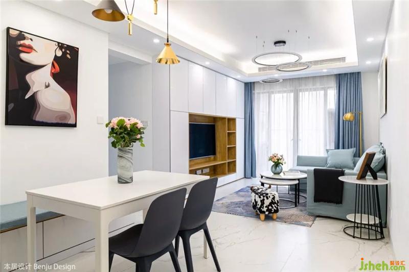 餐廳區(qū)域的面積不大,為了節(jié)省空間,定制了一排卡座,卡座底部也是一個(gè)收納空間,一舉兩得。