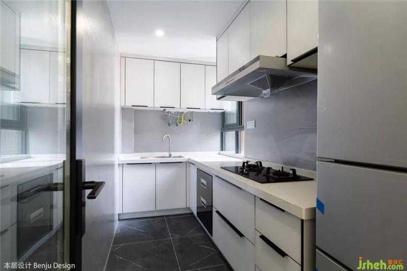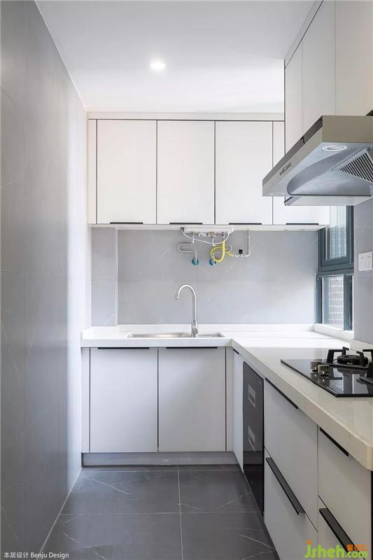 廚房采用L型設(shè)計(jì),灶臺(tái)和烤箱都是嵌入式,為操作臺(tái)省出更多空間。室內(nèi)設(shè)計(jì)師