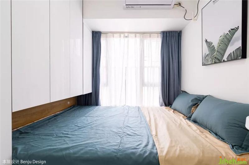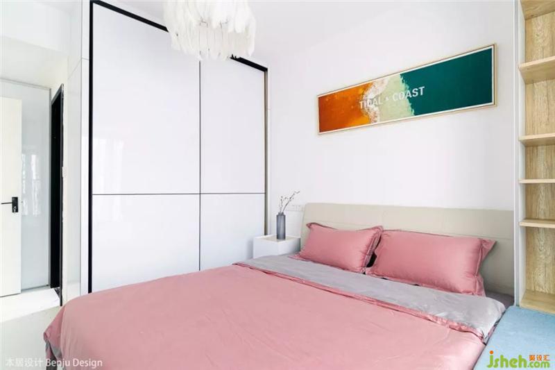 頂天立地的大衣柜,推拉門式,空出了床與衣柜之間的過(guò)道,方便掛取衣物。