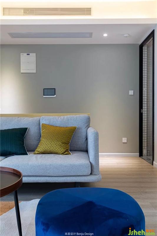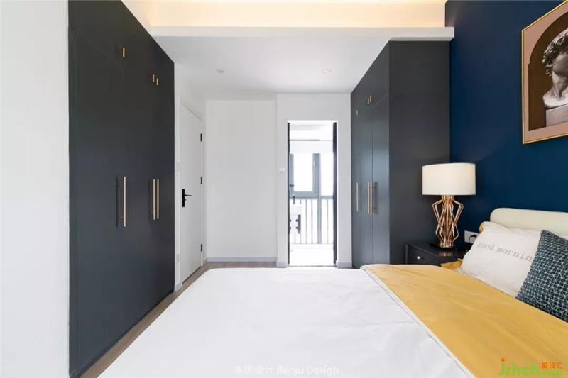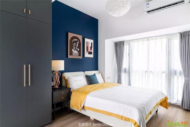 主臥衣柜是成品衣柜,深灰色與床頭藏藍(lán)色的背景墻相呼應(yīng)。為了不讓空間顯得暗沉,增加一個(gè)跳躍的顏色,黃色的床品在這里協(xié)調(diào)不突兀。室內(nèi)設(shè)計(jì)師