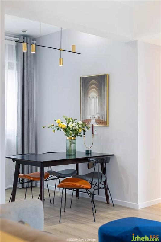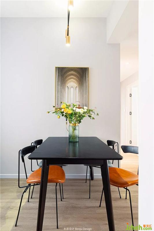 餐桌擺放在廚房門口處。北歐工業(yè)風(fēng)的餐廳,橡木桌+皮質(zhì)坐墊螞蟻椅,與客廳風(fēng)格碰撞,粗狂又不失溫柔,兩者結(jié)合和諧不跳躍。