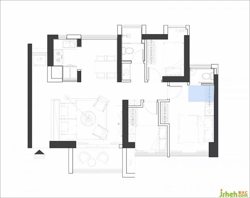 主臥縮小了衛(wèi)生間的面積,向衛(wèi)生間處內(nèi)移了80公分,既保證了衛(wèi)生間的使用,避免衛(wèi)生間的使用沖突,又增加了主臥的面積和儲物空間。室內(nèi)設(shè)計(jì)師