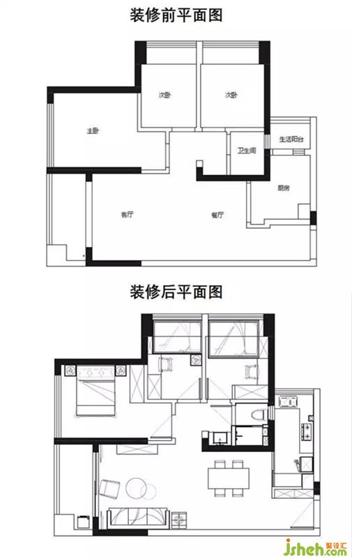 同時將餐廳和廚房的隔墻也后移了一些,擴(kuò)大了餐廳的空間,放下一張四人餐桌綽綽有余。但這樣的調(diào)整使廚房空間變得很小,所以最后將生活陽臺的空間劃歸廚房使用,讓廚房變成了一個長方形,不僅留出了冰箱的位置,廚房的使用面積也變大了。