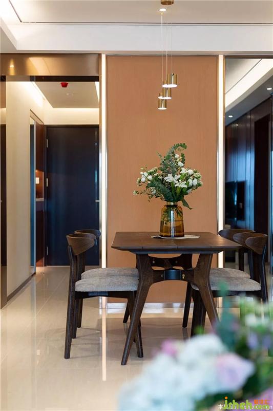 餐廳延續(xù)客廳的風(fēng)格,煙熏法國橡木的餐桌,保留了木質(zhì)的天然形態(tài),紋理清晰可見。餐桌后方的茶色玻璃移門劃分餐廳和廚房,高級的茶褐色使空間根據(jù)現(xiàn)代感。茶褐色空間,像極了梵高的名畫,收割中的田野風(fēng)景。墻上的掛畫正是梵高的名作,業(yè)主的最愛。