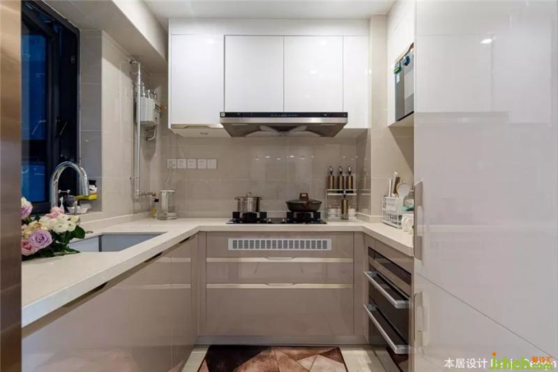 拉開移門,展現(xiàn)的又是不一樣的風(fēng)格。淺香檳色+白色的櫥柜,廚具和冰箱都是嵌入式,平面的設(shè)計(jì)使得廚房看起來清爽整潔。裝修設(shè)計(jì)